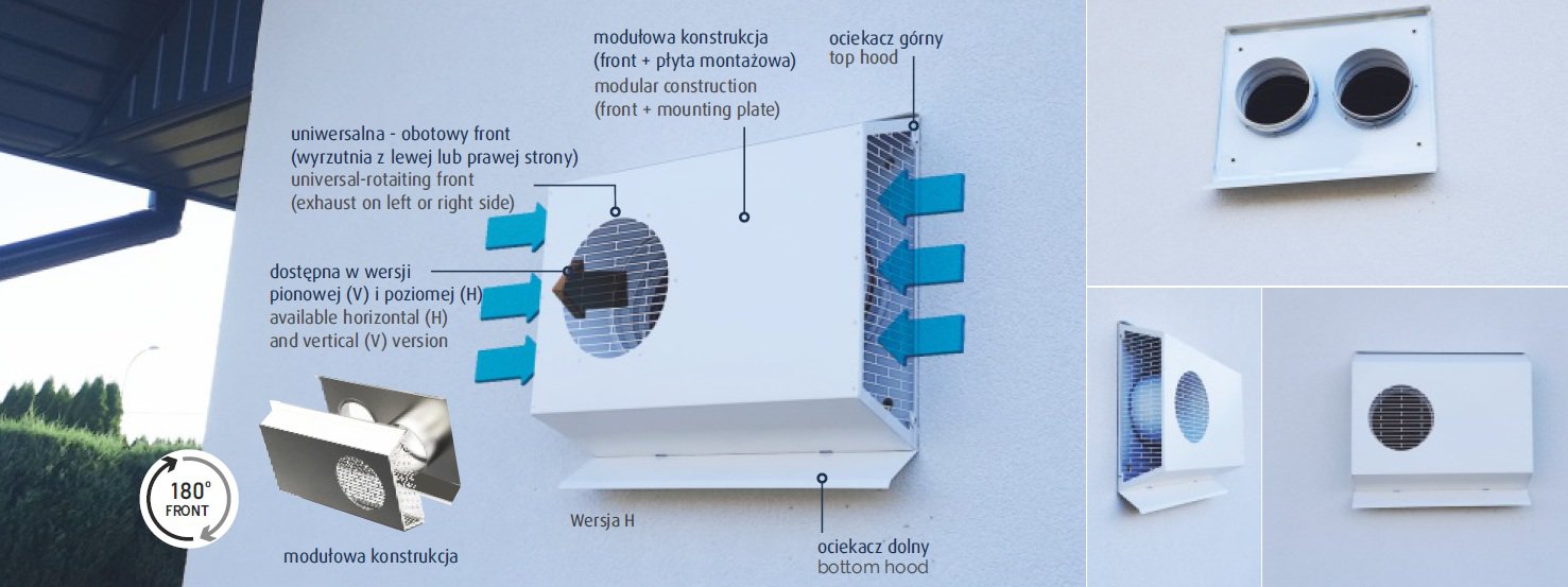 Czerpnio-wyrzutnia zblokowana QUADRO H (pozioma czerpnia i wyrzutnia w 1 obudowie). Stosowana w przypadkach kiedy nie ma możliwości zastosowania oddzielnej czerpni i wyrzutni w wymaganej odległości od siebie. Konstrukcja sprawia, że strumienie powietrza nie mieszają się i nie zakłócają swojego przepływu.